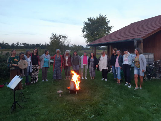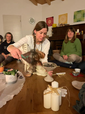 Wir singen heilsame Lieder, Mantras Und Kraftlieder und verbinden uns noch mehr mit unserem Körper, indem wir in Kreistänzen in der Gruppe tanzen oder uns in freiem, intuitivem Tanz zur Musik