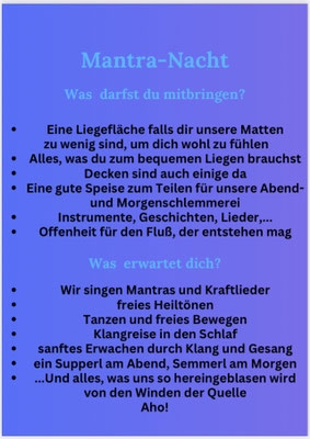 Wenn du gern intensiver in die Welt der Mantras eintauchen möchtest, gibt es hier die Möglichkeit, mit Gleichgesinnten, Mantras zu singen. Durch das stetige Wiederholen der verschiedenen Mantras